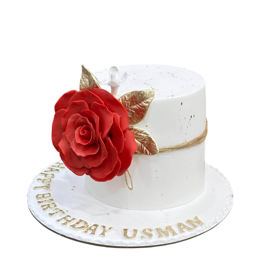 Celebrate with our Romantic Birthday Cake For Husband, featuring a smooth white frosting base adorned with a bold red rose, gold leaf accents, and rustic twine detailing. The cake includes a personalized birthday message in gold script. A refined and heartfelt centerpiece for celebrating your husband’s special day. Order now for next-day delivery in Dubai, Sharjah, and Ajman.