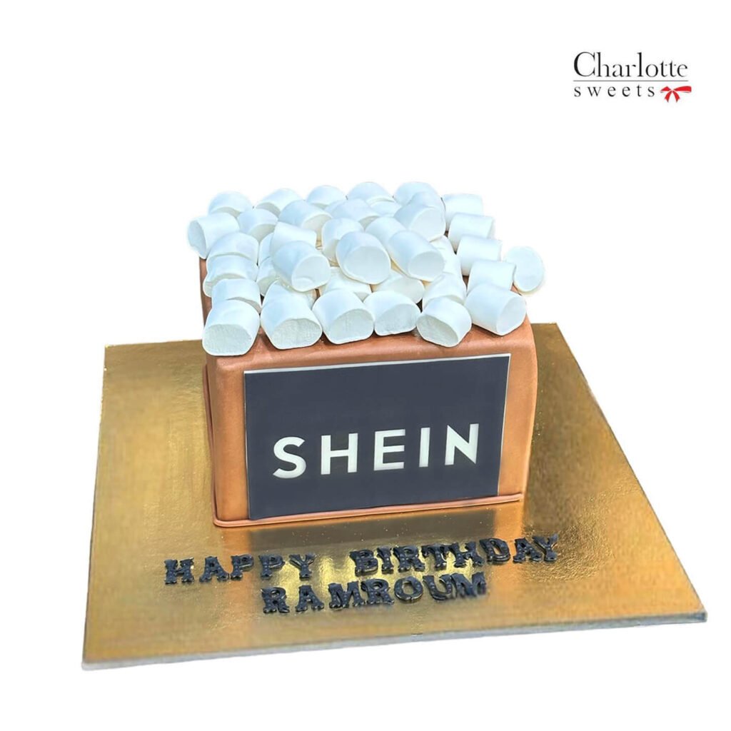 This playful and trendy cake is the perfect gift for any Shein lover. The cake is shaped like a box filled with fluffy marshmallows, a fun and whimsical touch. The black and gold color scheme is both stylish and elegant, while the “SHEIN” logo adds a touch of brand recognition. Order online for next-day delivery in Dubai, Sharjah, and Ajman.
