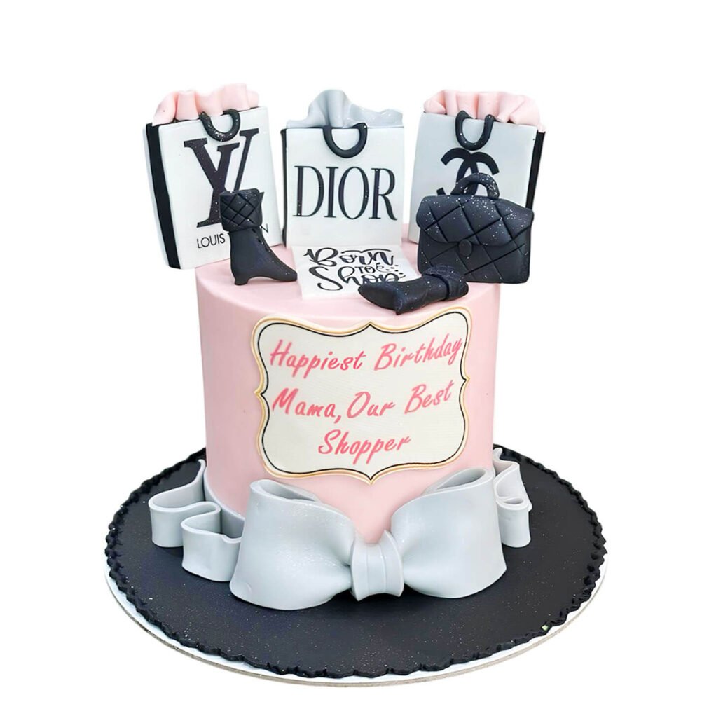 Celebrate with our Shopping Cake, featuring a chic pink frosting base with black accents and elegant white fondant bows. The cake is topped with luxury-themed decorations including designer shopping bags, high heels, and quilted handbags from iconic brands like Louis Vuitton, Dior, and Chanel. A playful message adds a personal touch for the ultimate fashion lover. Order now for next-day delivery in Dubai, Sharjah, and Ajman.