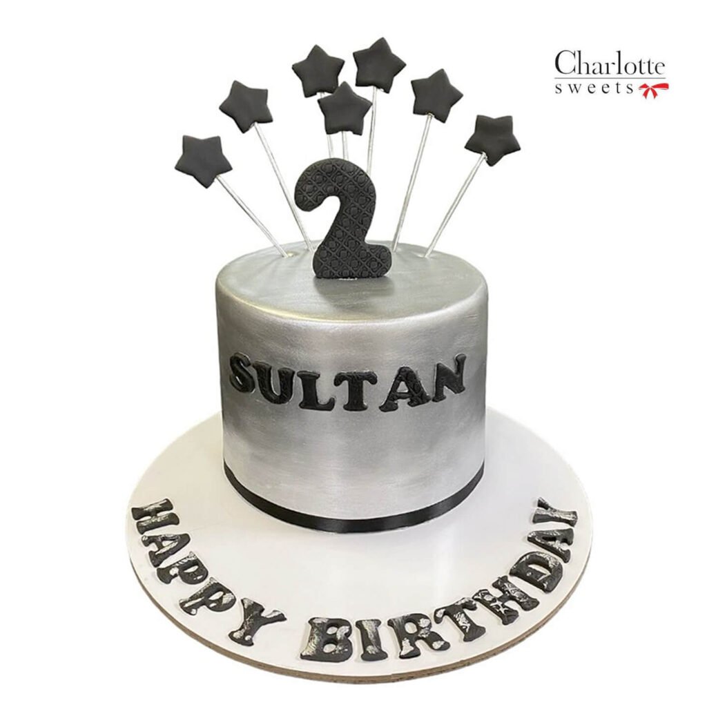 Celebrate a special 2nd birthday with this modern and personalized cake. The cake features a sleek, cylindrical silver base, creating a contemporary and elegant look. The name “SULTAN” is prominently displayed in black lettering on the cake’s side, adding a personal touch. A black glittery “2” sits atop the cake, marking the milestone age with style. Black star-shaped toppers on silver wires radiate outwards, adding a playful and festive element. The cake rests on a white cake board with “HAPPY BIRTHDAY” written in bold black letters, making it a perfect centerpiece for a memorable celebration. Order online for next-day delivery in Dubai, Sharjah, and Ajman.