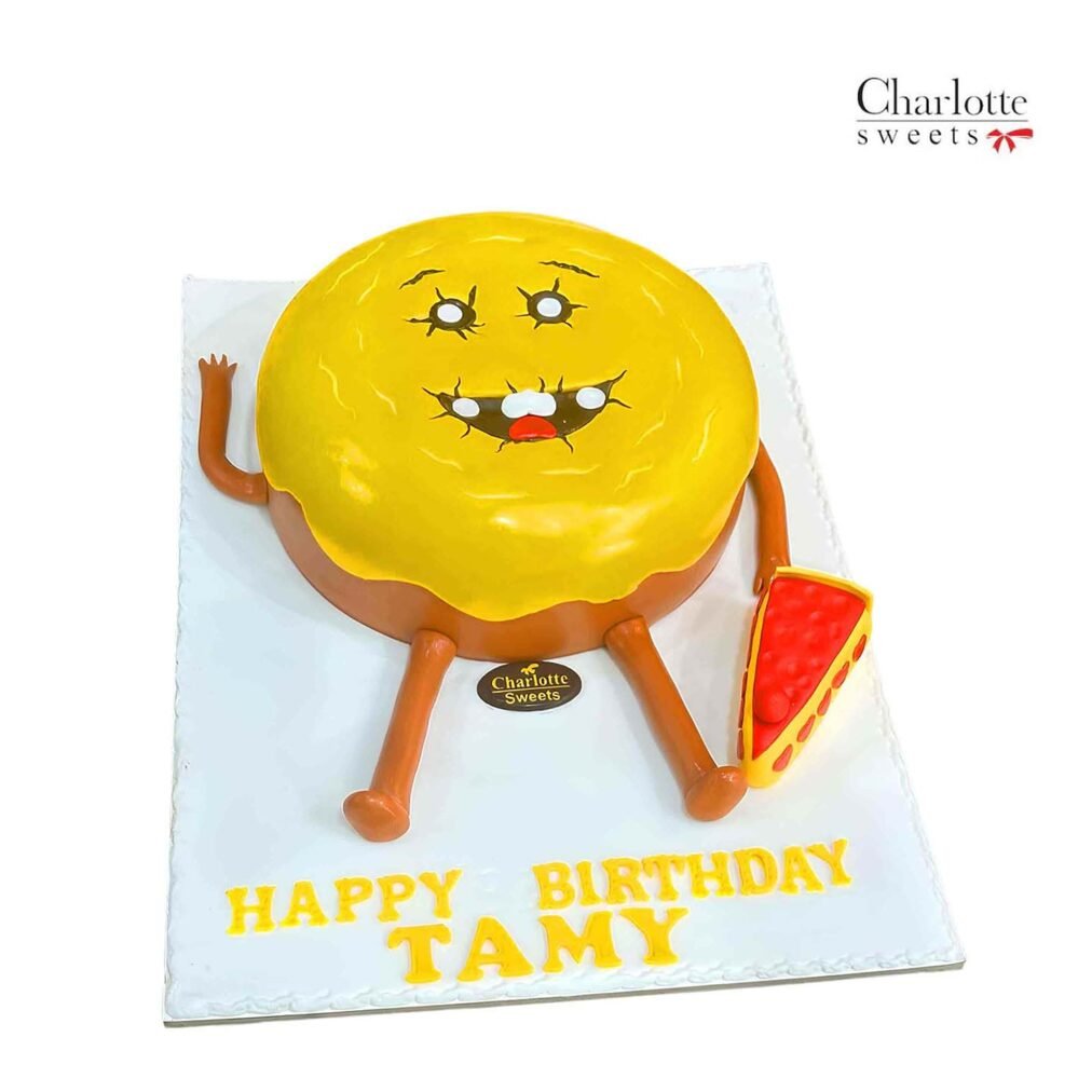 This cake features a playful, cartoon-like design with a yellow, circular face and brown limbs. The face has white eyes with black pupils, a black mouth, and white teeth. The cake is holding a red slice of cake in one hand. The cake board is scripted with “HAPPY BIRTHDAY TAMY” in yellow lettering. This cake is a fun and whimsical centerpiece for a celebration. Order online for next-day delivery in Dubai, Sharjah, and Ajman.