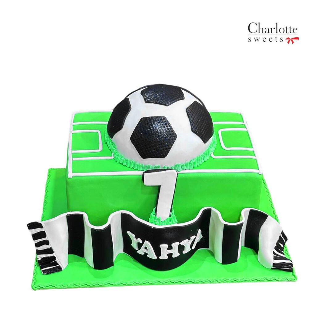 This is a creative and sporty cake featuring a large soccer ball on a green field-like base with a goalpost. The number “7” and the name “Yahy” are prominently displayed, along with a black and white striped scarf. Order online for next-day delivery in Dubai, Sharjah, and Ajman.