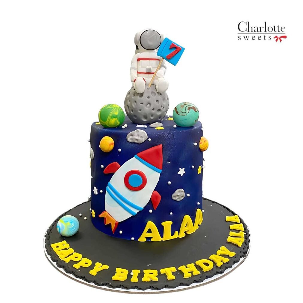 This cake is themed around space, featuring a dark blue base with a white rocket design and star accents. It’s topped with an astronaut figurine holding a flag with the number “7” on a moon-like sphere. The cake also includes small planet decorations and the message “HAPPY BIRTHDAY ALAA” in yellow lettering on a black base. Order online for next-day delivery in Dubai, Sharjah, and Ajman.