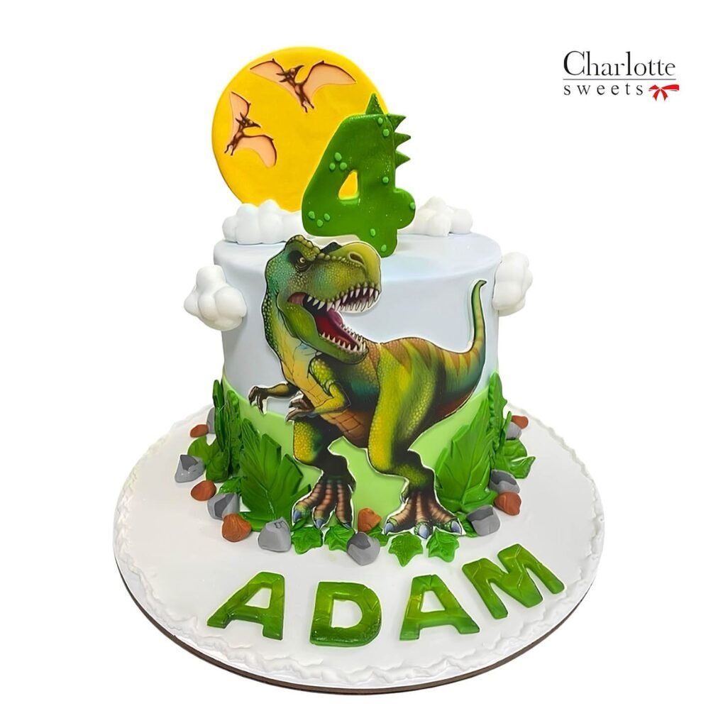 Celebrate with our T Rex Cake, featuring a detailed illustration of a T Rex surrounded by green foliage and small rocks. The top showcases a yellow circular decoration with two flying pterodactyls and a green number “4,” marking the birthday celebration. The base displays the name “ADAM” in bold green letters, adding a personalized touch. Order now for next-day delivery in Dubai, Sharjah, and Ajman.