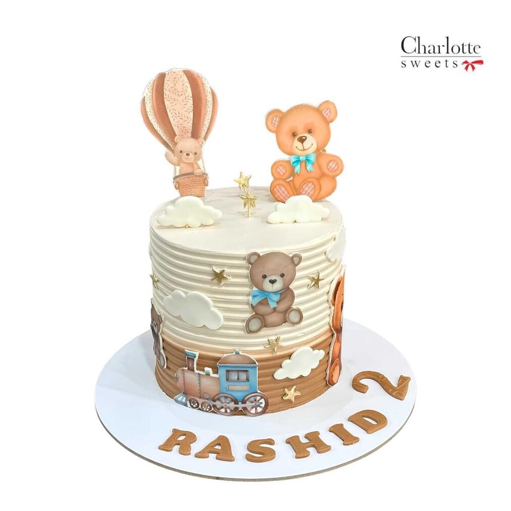 Soft, neutral color palette, featuring teddy bear and transportation themes. The cake includes a hot air balloon topper with a teddy bear, teddy bear cutouts with blue bow ties, a train design, cloud-like fondant decorations, and star accents. The name “RASHID” and the number “2” are displayed on the base. Order online for next-day delivery in Dubai, Sharjah, and Ajman.