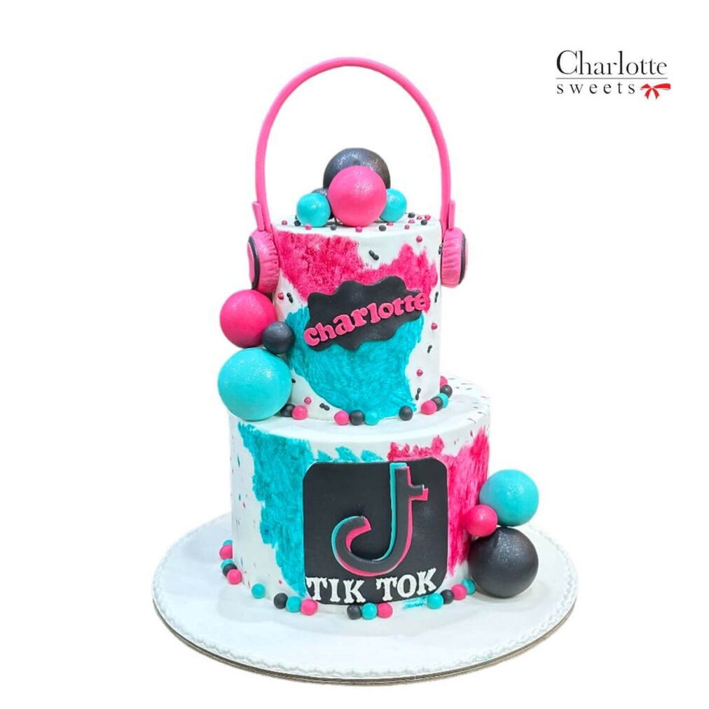 This is a two-tiered cake with a vibrant, tie-dye inspired design in pink, blue, and white, featuring a prominent TikTok theme. The cake is adorned with fondant headphones, spheres in matching colors, and the TikTok logo, with the name “Charlotte” displayed on the top tier. Order online for next-day delivery in Dubai, Sharjah, and Ajman.