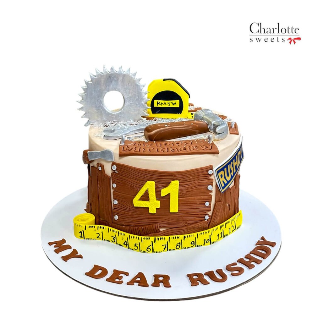 Craft a memorable celebration with our unique Tool Cake, designed to resemble a wooden toolbox, complete with edible tools such as a saw blade, hammer, wrench, and a yellow tape measure. The front of the cake proudly displays a yellow number “41” alongside “MY DEAR RUSHDY” written in brown icing, making it the perfect centerpiece for a handyman or DIY enthusiast’s birthday. Order online for next-day delivery in Dubai, Sharjah, and Ajman.