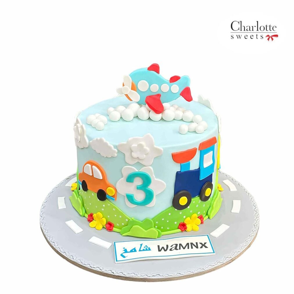 This cake features a transportation theme with an airplane topper. It includes a train and car design on the side. The cake has cloud and flower accents. The base is gray and scripted with “شامخ WAMNX”. This is a fun centerpiece for a celebration. Order online for next-day delivery in Dubai, Sharjah, and Ajman.