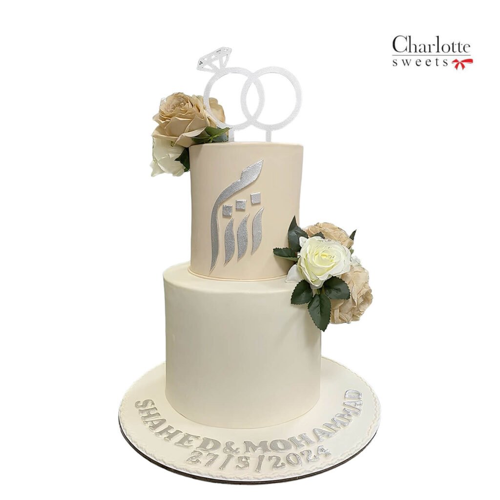 This elegant two-tiered cake is the perfect centerpiece for your Wedding celebration. The ivory base is adorned with delicate floral arrangements and a pair of intertwined rings symbolizing your union. The Arabic calligraphy adds a touch of cultural significance and the inscription. Order online for next-day delivery in Dubai, Sharjah, and Ajman.