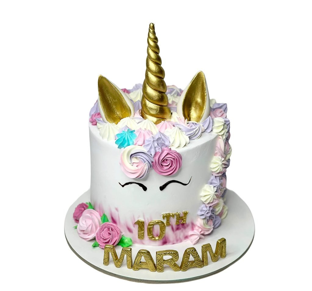A magical unicorn cake for a special little girl! This enchanting cake features a soft white base adorned with colorful swirls of frosting, delicate pink roses, and a golden unicorn horn and ears. The cake is personalized with the name “Maram” and the number “10,” making it perfect for a 10th birthday celebration.