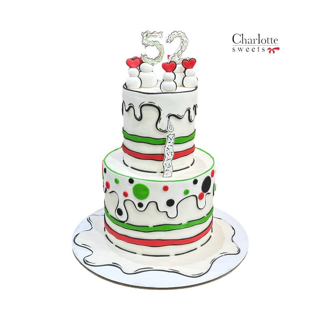 Celebrate the UAE’s National Day with this festive and delicious cake. The cake is adorned with the colors of the UAE flag, featuring red, white, green, and black stripes. The top tier is decorated with a number “52” to commemorate the country’s 52nd National Day. The cake is finished with a touch of white fondant and colorful sprinkles, adding a playful and festive touch.