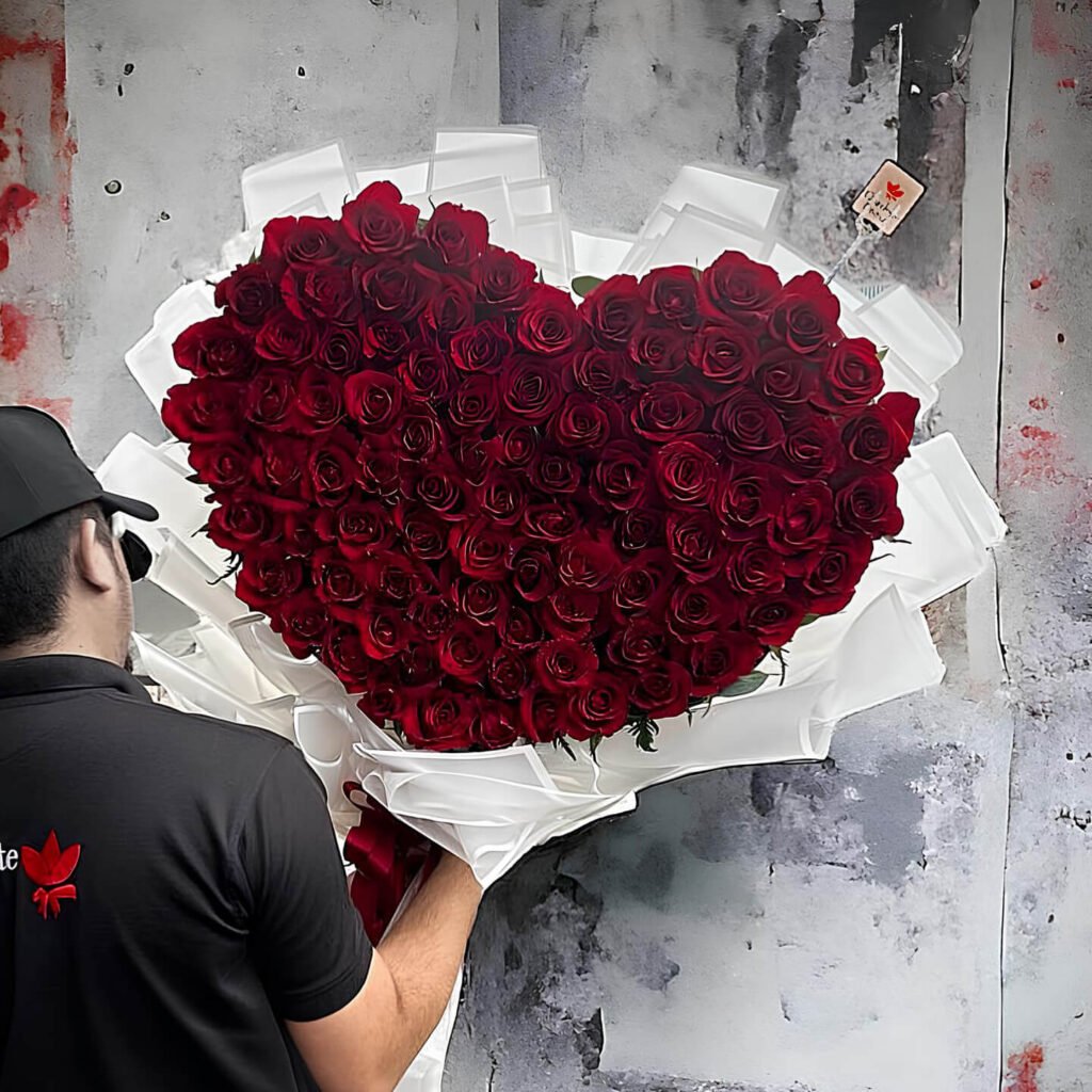 A captivating heart-shaped bouquet of deep red roses, tightly clustered to create a full and luxurious look. The roses are nestled within layers of crisp white wrapping, creating a beautiful contrast. A small tag, partially visible, hints at branding or a message. This romantic and elegant bouquet is a perfect expression of love and affection. Order online today for next-day delivery in Dubai and make a lasting impression with this grand gesture of affection.