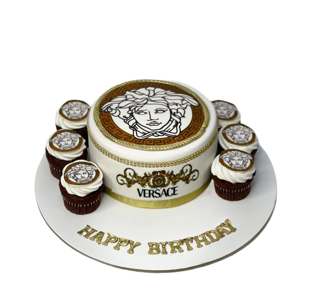 - Matching cupcakes: A set of cupcakes with the Versace logo, creating a cohesive and visually appealing presentation.