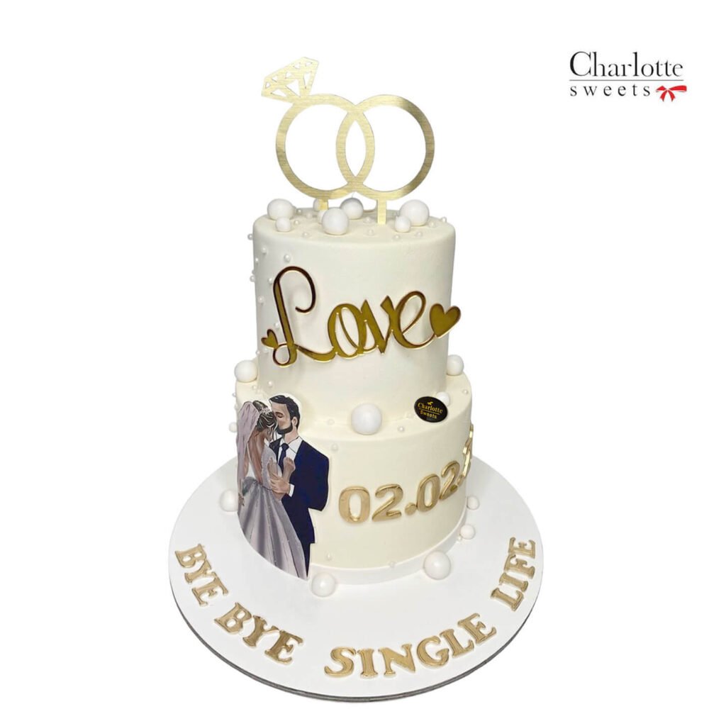 This elegant two-tiered cake is the perfect centerpiece for an engagement party, Or a wedding cake. The pristine white tiers are adorned with a delicate pattern of pearls and a charming image of a bride and groom sharing a kiss. The cake is topped with a pair of interlocking rings and the word “Love,” symbolizing the union of two souls. The base features the inscription “Bye Bye Single Life” and the date adding a personal touch to this special occasion. Order online for next-day delivery in Dubai, Sharjah, and Ajman.