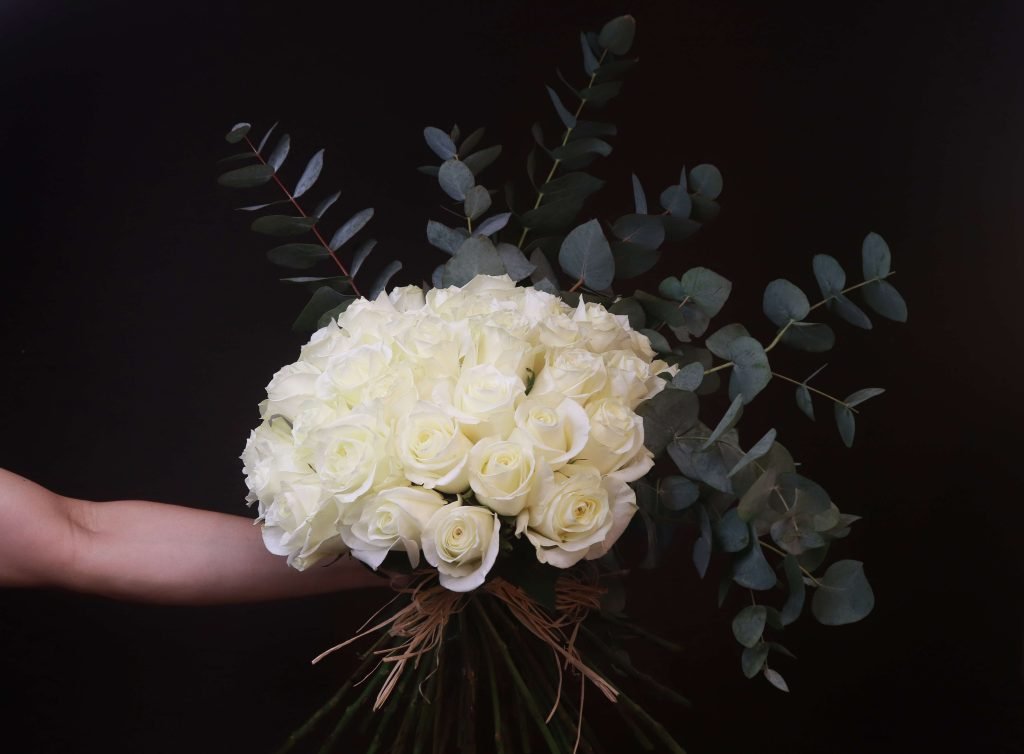 This exquisite bouquet features a cascade of soft White Roses , accented by delicate eucalyptus leaves. The white hues create a serene and Peaceful atmosphere. Perfect for birthdays, anniversaries, Get well soon or simply as a gesture of affection, this bouquet is sure to delight.